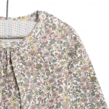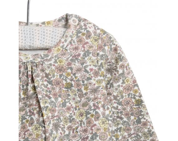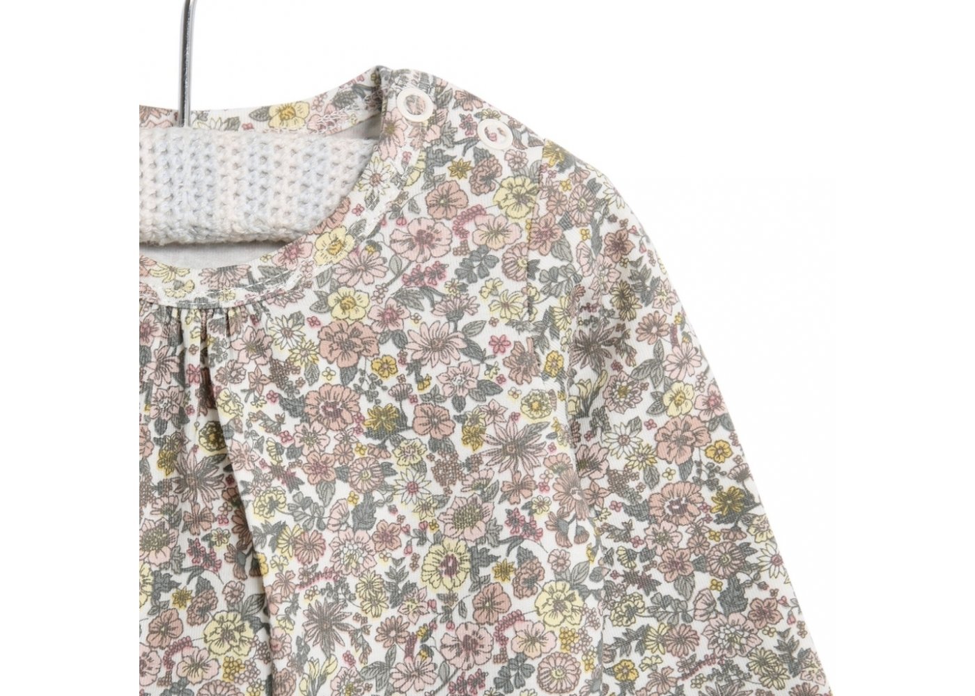Lækker bodysuit med håndtegnet design blomsterprintBody med fin rynk i halsudskæring, lange ærmer og ben. Den lukkes med trykknapper på venstre skulder og hele vejen rundt imellem ben.