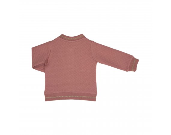 Trøjen har flotte ribstrik i hals, på ærmer og forneden med smukke guld striber. Desuden en flot lynlås med guld look.