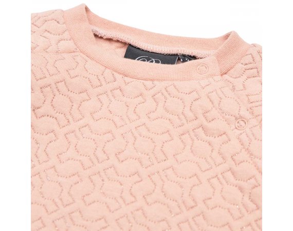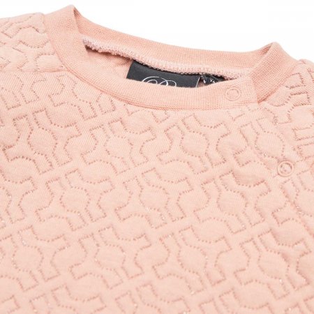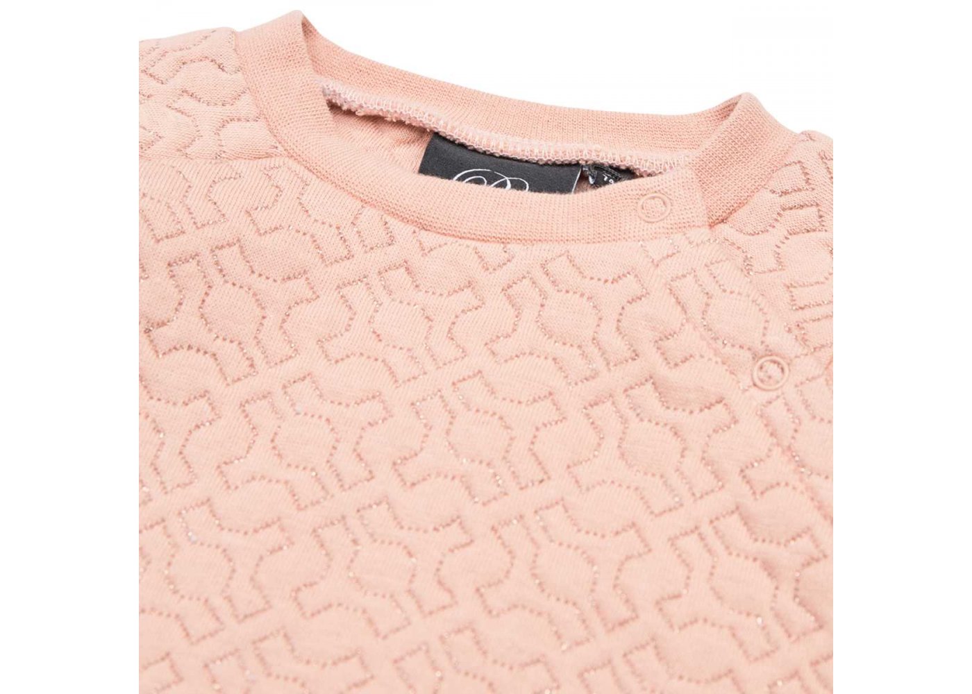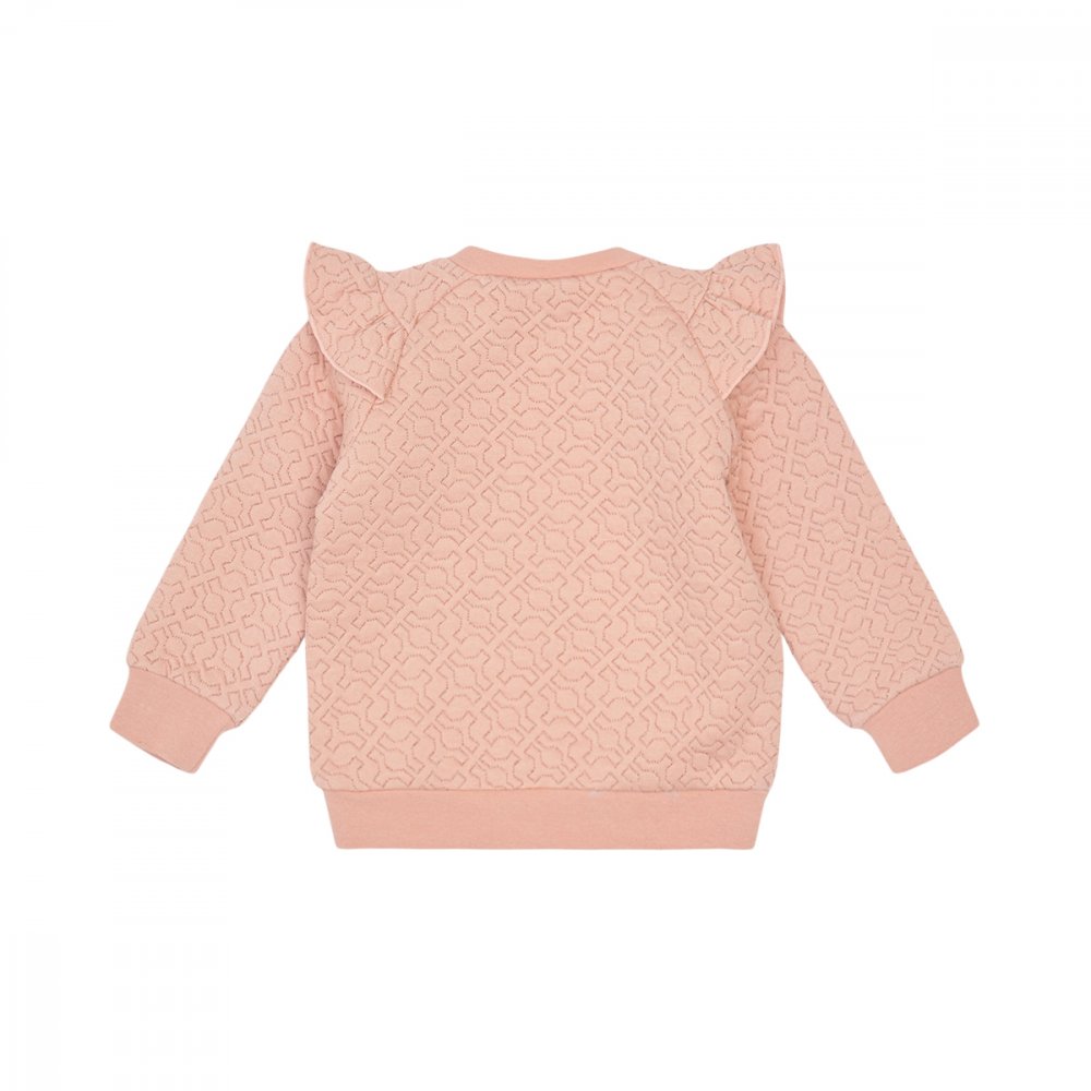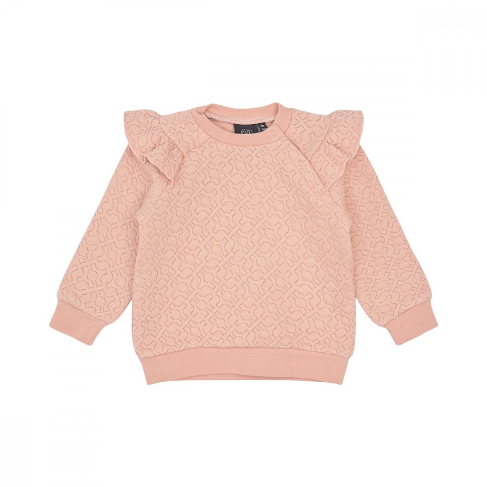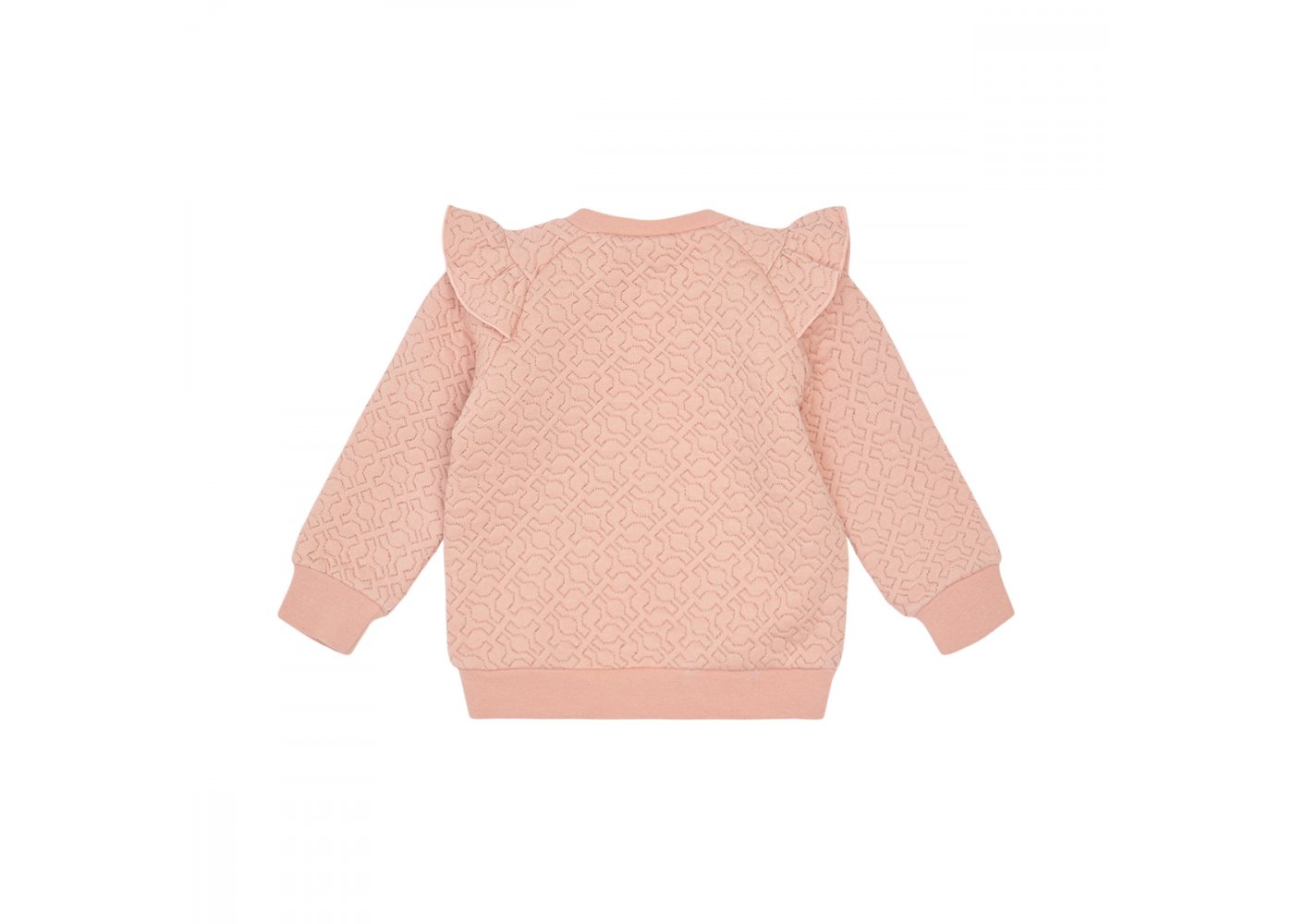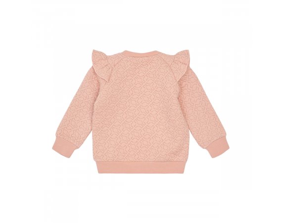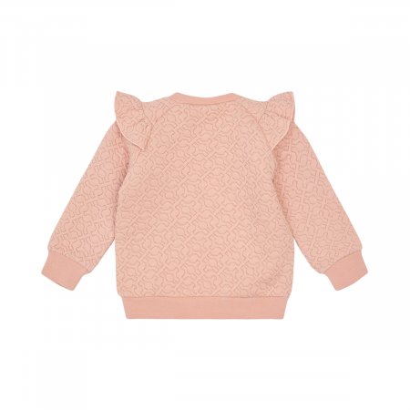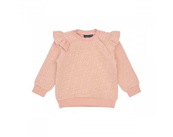 Yndig sweatshirt i lys rosa med mønster og guldglimmer trådSweatshirt med lange raglanærmer og en flot flæsekant på skuldre.