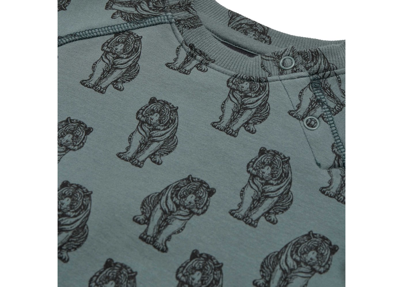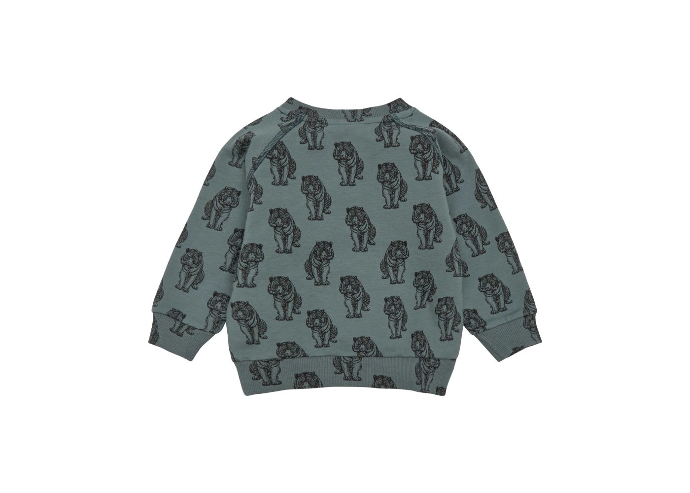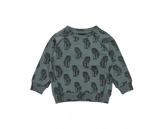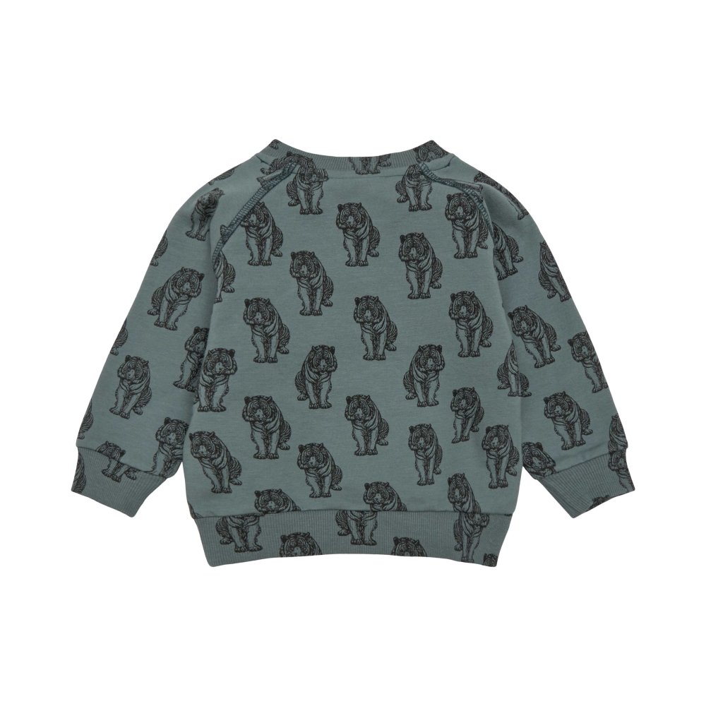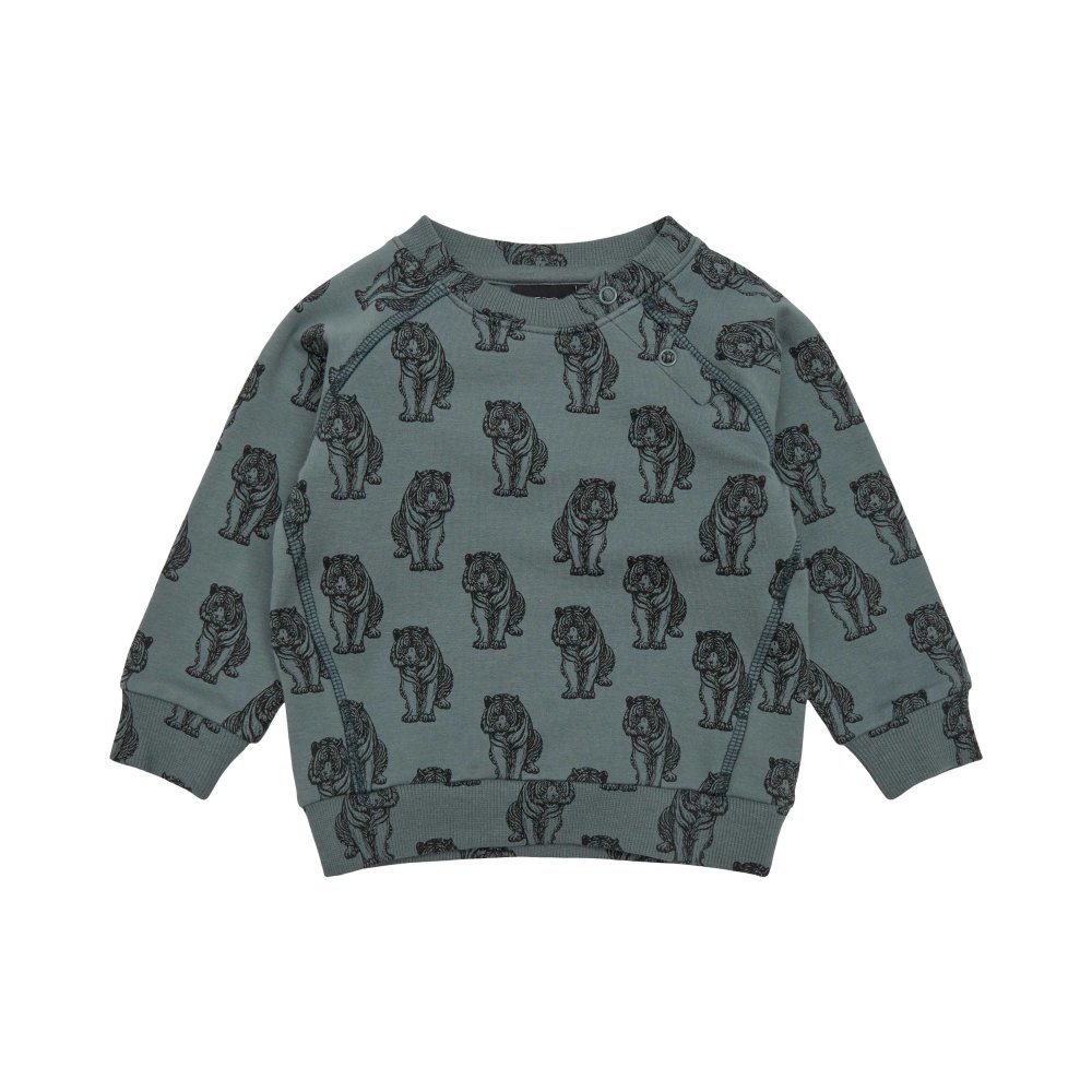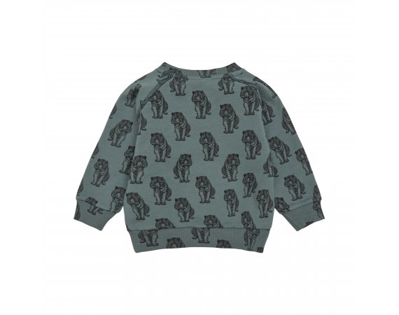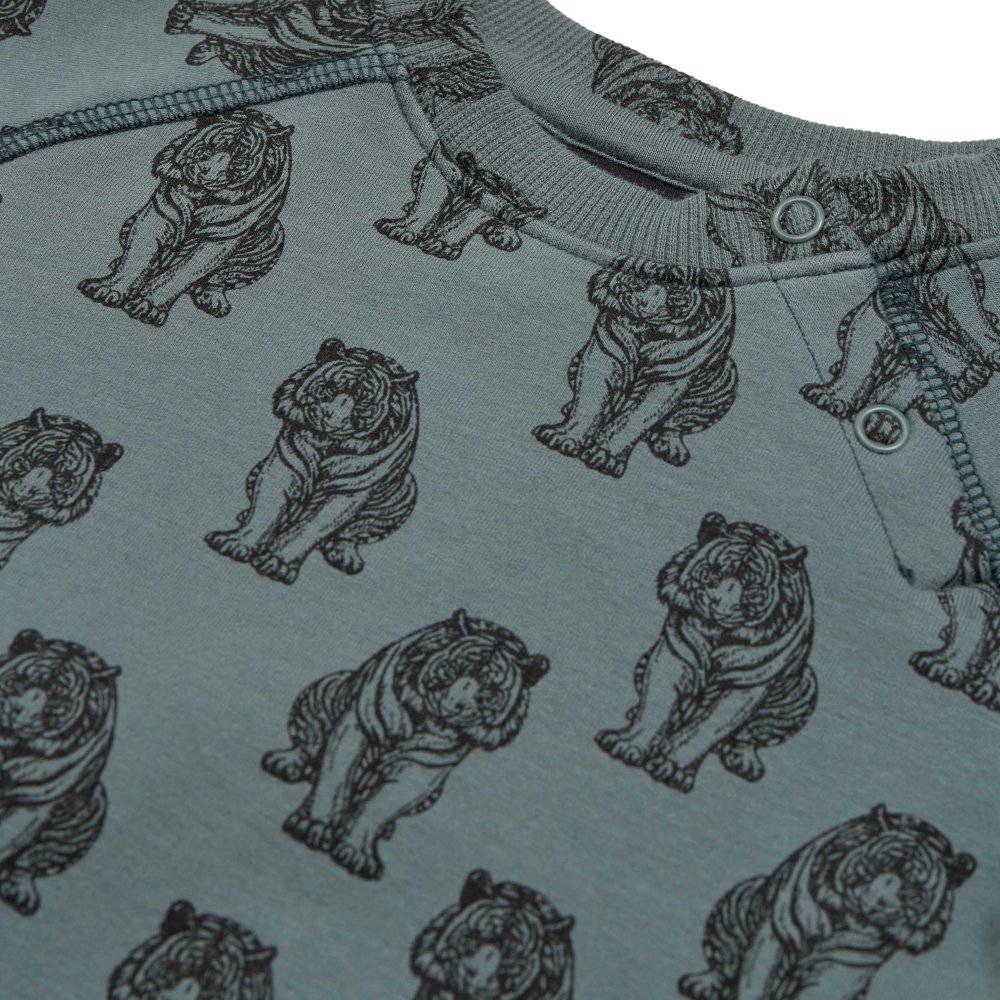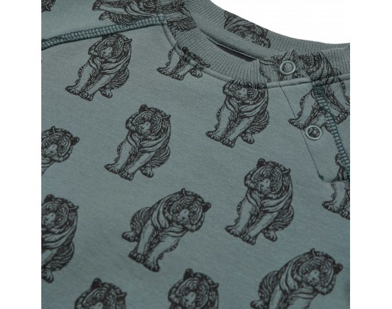 Lækker langærmet sweatshirt i støvet grøn med sort tigerprint.Trøjen har raglanærmer og brede ribkanter i alle åbninger. Den åbnes med trykknapper foran på venstre bryst.