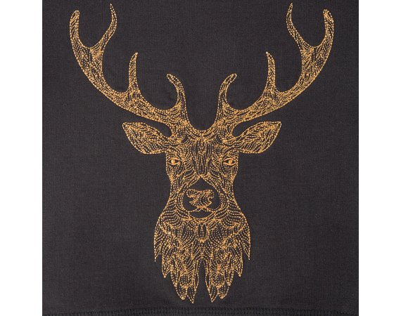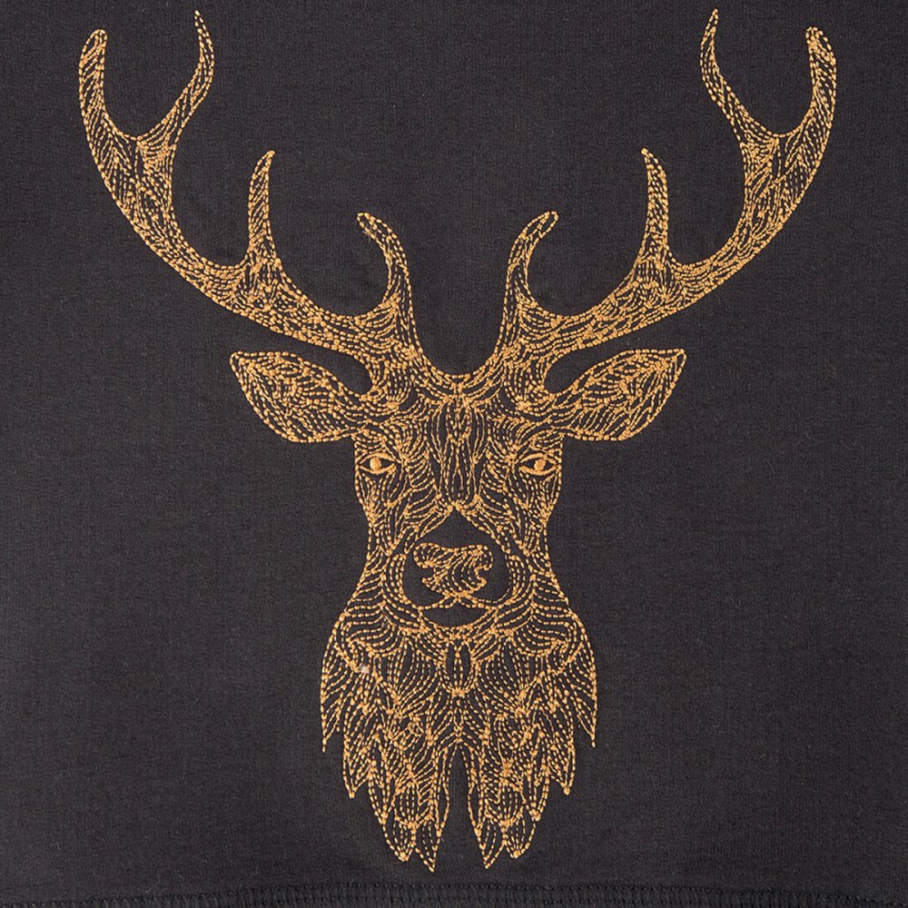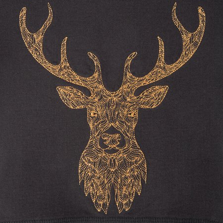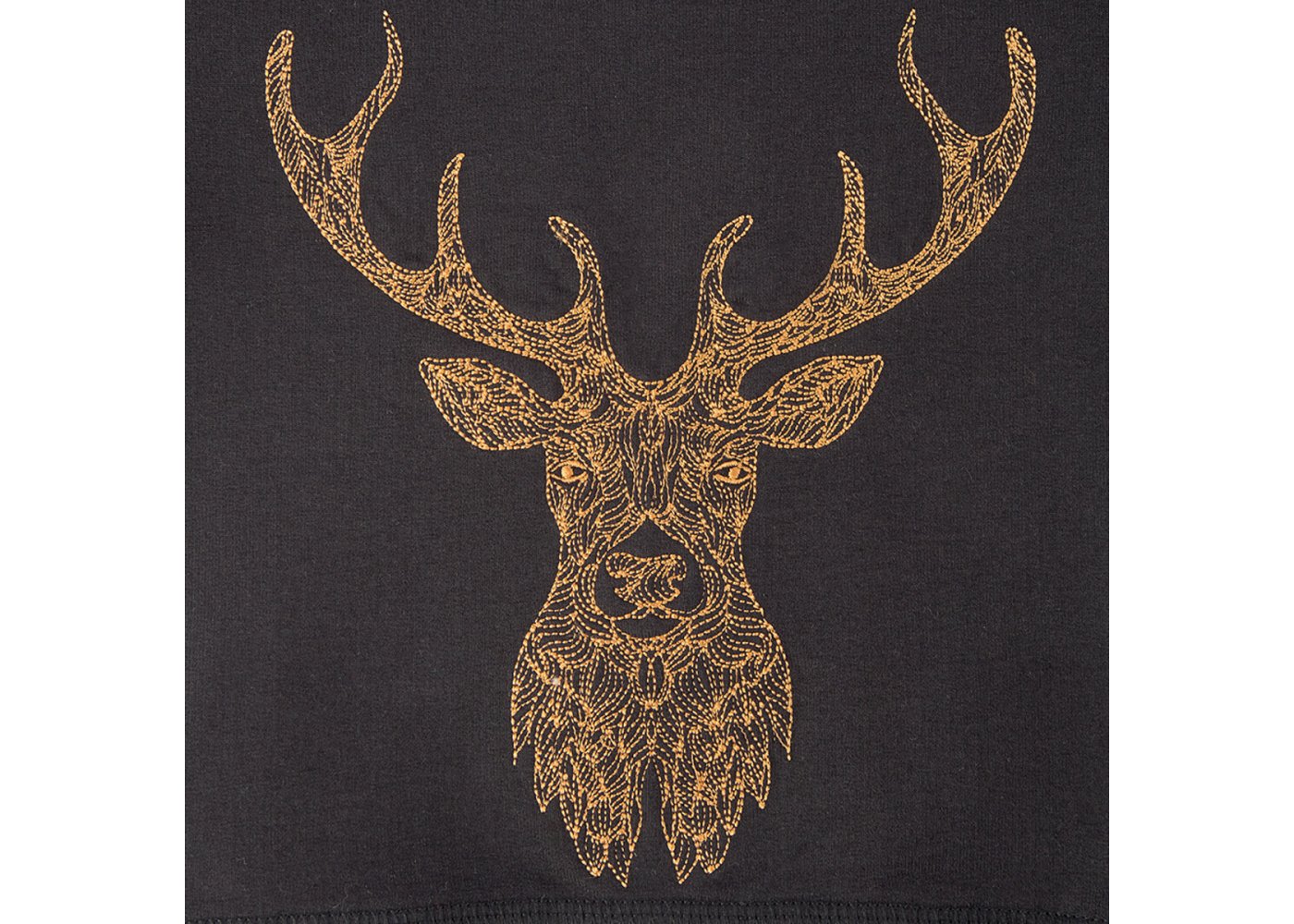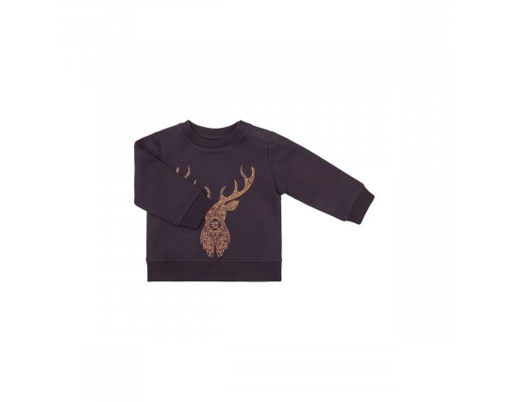Flot sort sweatshirt med en guldbroderet kronhjort på fronten.Sweatshirten har lækker børstet bomuld på indersiden, lange ærmer og brede ribkanter i alle åbninger. Den lukkes med trykknapper på venstre skulder.