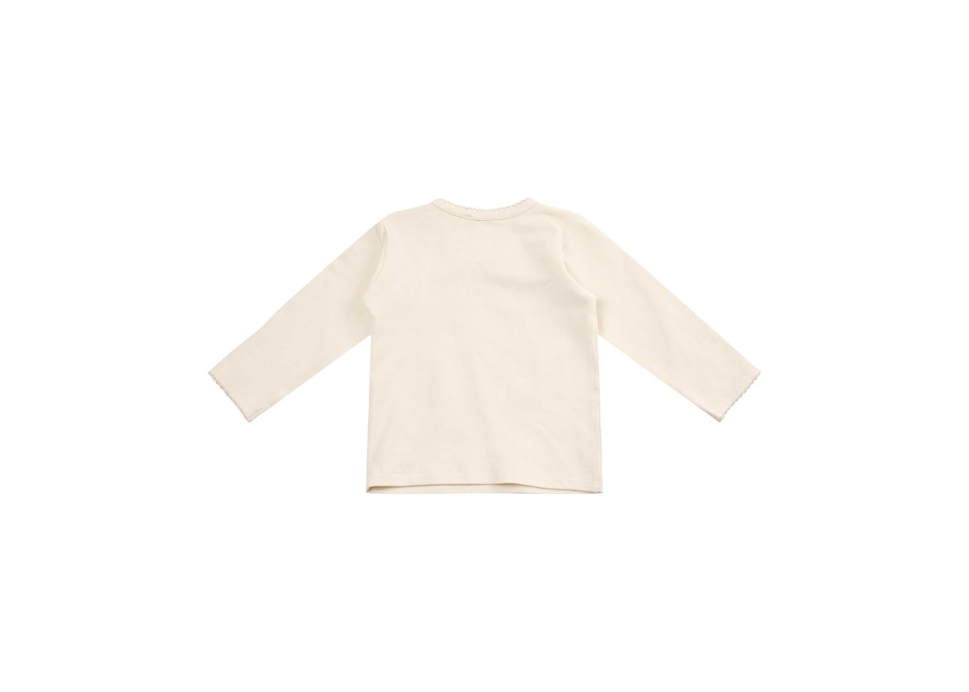 T-shirten har en fast ribkant med fint blonde i halsudskæring og lukkes med trykknapper på venstre skulder.