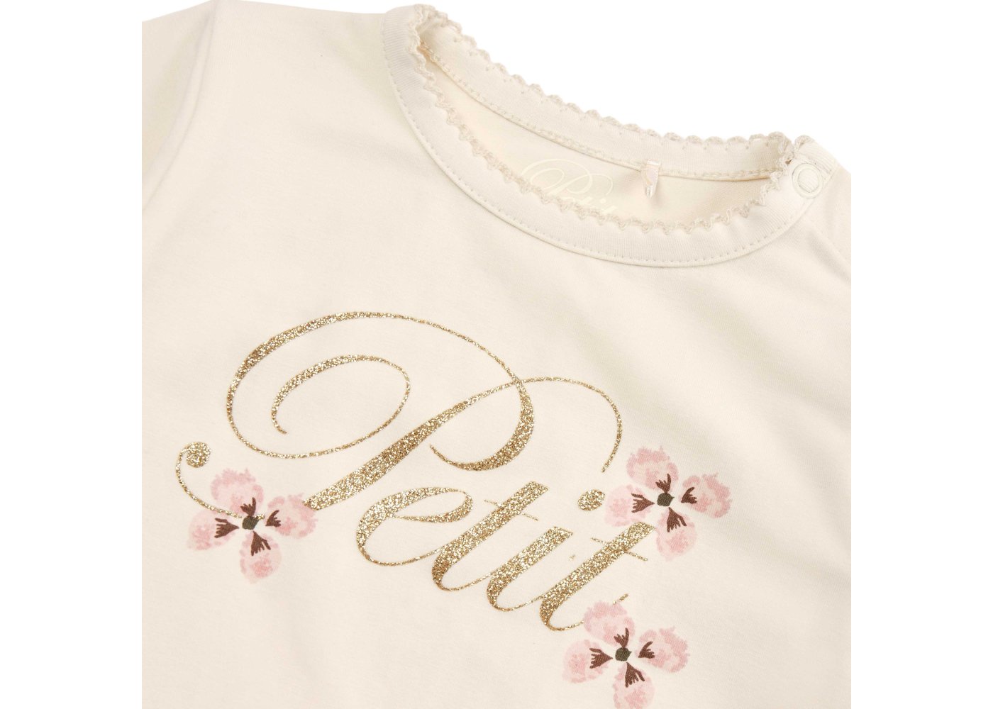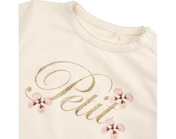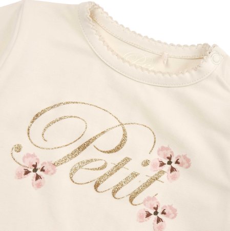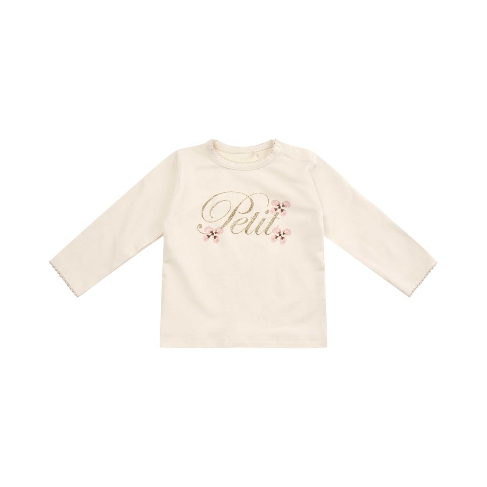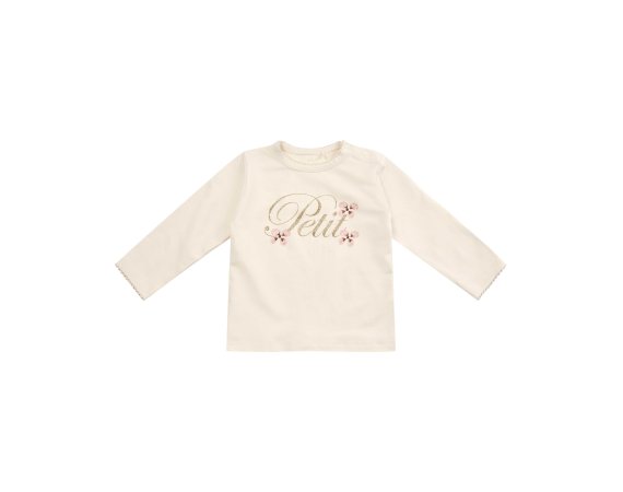 Sød langærmet t-shirt med blomster og guldskrift foran fra Petit by Sofie Schnoor.