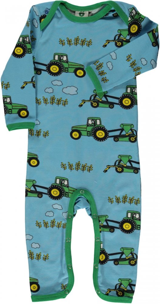 Blød og lækker heldragt i økologisk bomuld med all-over traktor printHeldragten har ensfarvet kant ved alle åbninger, kuvertlukning på skuldre og trykknapper der kan åbnes hele vejen mellem ben.
